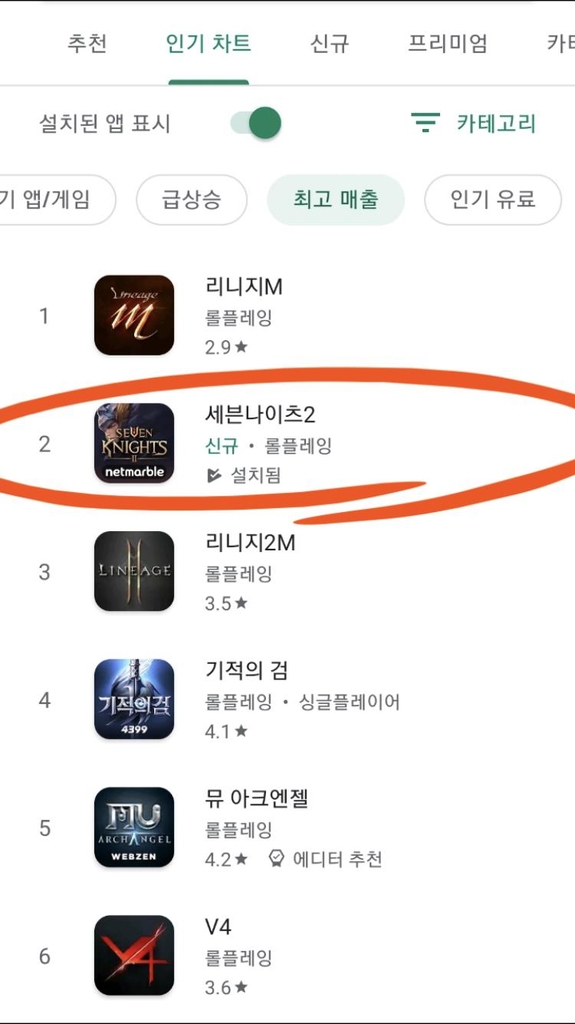매출 1위는 리니지M이고, 2위였던 리니지2M은 세븐나이츠2에 밀려 3위로 내려갔다.