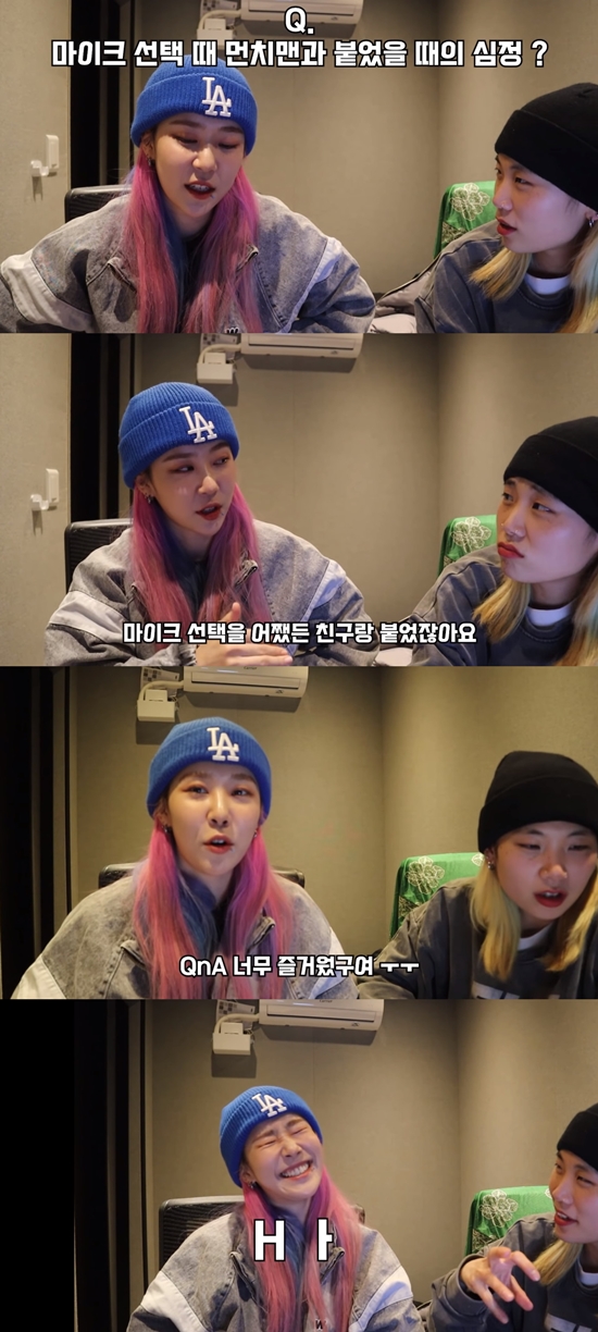 이어 미란이는 경연곡 '아츄' 가사 중 "같은 거리 동네 출신 이뤄낼 차례가 됐어 직진"이 먼치맨을 향한 '샤라웃'이냐는 질문을 받았다. 미란이는 "맞다. 진짜 예리하다. 저는 제 마음속에서 같이 경연을 하고 있으니까 누가 올라가든 가사 안에 넣고 싶었다. '직진'도 먼치맨의 피처링 곡이다. '샤라웃'한 게 맞다"고 답했다.