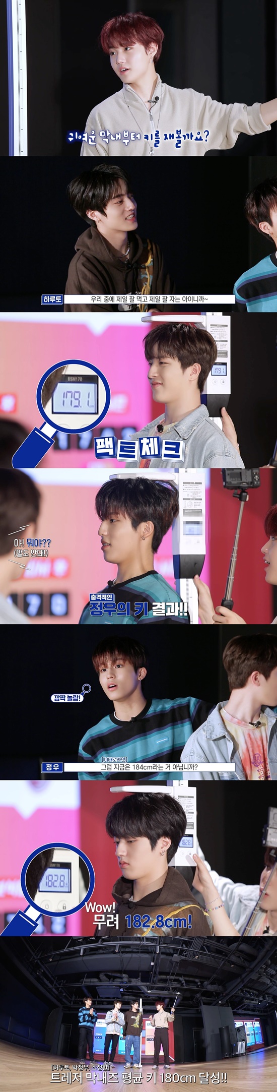 이로써 트레저 막내 라인의 평균 키는 180cm로 확인됐다. 일일 MC 도영은 "우리가 원하는 목표치까지 갈 수 있도록 우리 트레저 메이커 분도 건강하시고 먹고 자고 열심히 하자"라고 말하며 마지막까지 트레저 메이커에 대한 사랑도 잊지 않았다.