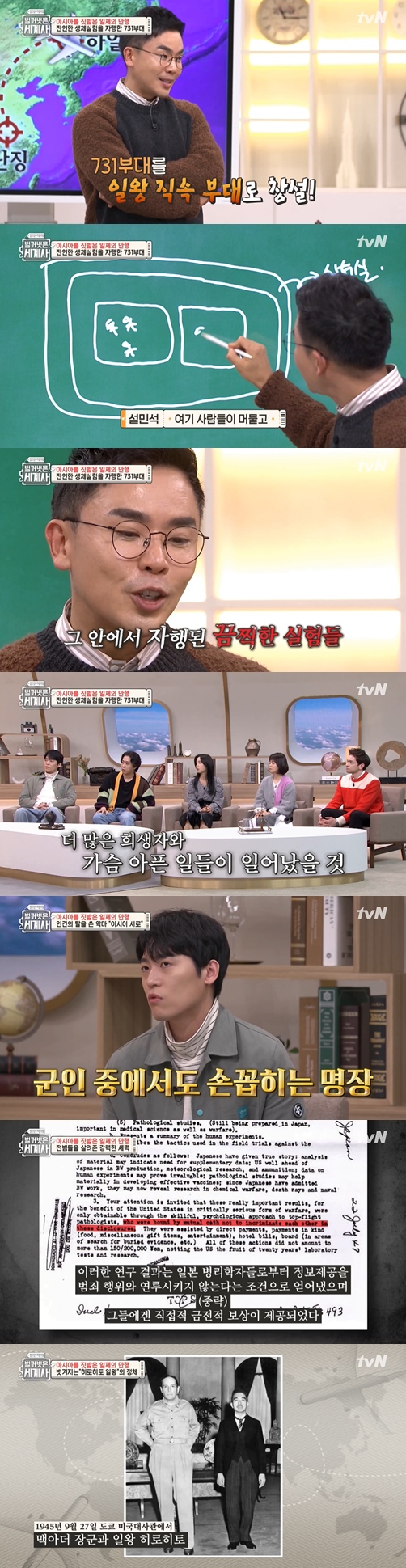 또 설민석은 "그 안에서 이뤄지는 것들은 정말 끔찍했다. 3일에 한 번씩 500ml의 피를 뽑아갔다. 몸 상태가 안 좋아지면 독극물 주사해서 죽이고 해부하고 소각해버리는 과정을 거쳤던 곳이 731 부대"라며 "흑사병, 콜레라, 천연두, 매독, 독가스 등 다양한 실험을 했다"고 말해 충격을 자아냈다.