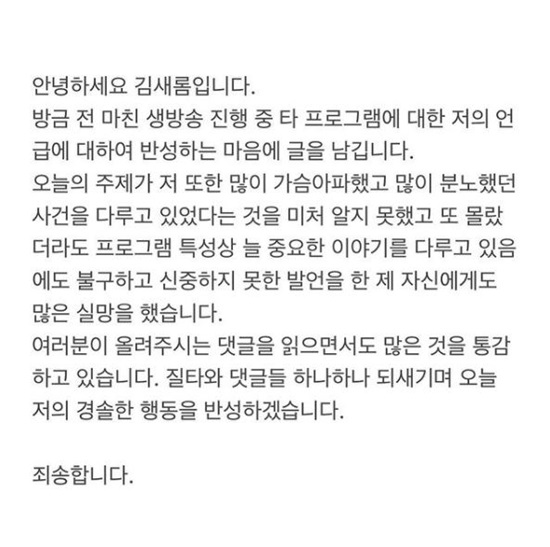 하루가 지나도 파장이 계속됐고, 김새롬은 자신의 인스타그램을 통해 "방금 전 마친 생방송 진행 중 타 프로그램에 대한 저의 언급에 대해 반성하는 마음에 글을 남긴다"며 "오늘의 주제가 저 또한 많이 가슴 아파했고 많이 분노했던 사건을 다루고 있었다는 것을 미처 알지 못했고 또 몰랐더라도 프로그램 특성상 늘 중요한 이야기를 다루고 있음에도 불구하고 신중하지 못한 발언을 한 제 자신에게도 많은 실망을 했다"고 사과했다.