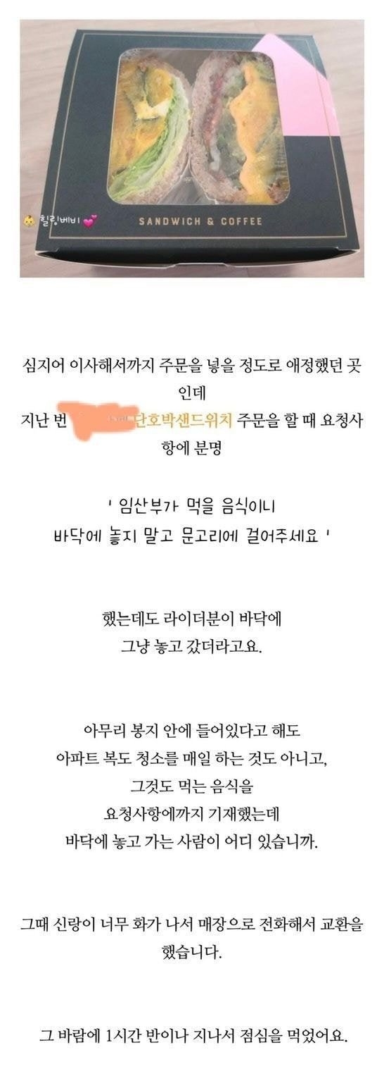 이어 조민아는 "요청 사항에 '임산부가 먹을 음식이니 바닥에 놓지 말고 문고리에 걸어주세요'라고 했는데 라이더 분이 바닥에 그냥 놓고 갔다"며 "아무리 봉지 안에 들어있다고 해도 아파트 복도 청소를 매일 하는 것도 아니고 그것도 먹는 음식을 요청사항에까지 기재했는데 바닥에 놓고 가는 사람이 어디 있나. 그때 신랑이 너무 화가 나서 매장으로 전화해서 교환을 했다. 그 바람에 1시간 반이나 지나서 점심을 먹었다"고 호소했다.