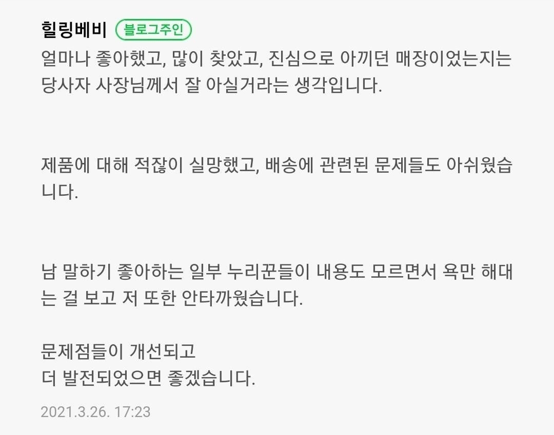 이에 조민아는 "얼마나 좋아했고, 많이 찾았고, 진심으로 아끼던 매장이었는지는 당사자 사장님께서 잘 아실 거라는 생각이다. 제품에 대해 적잖이 실망했고, 배송에 관련된 문제들도 아쉬웠다. 남 말 하기 좋아하는 일부 누리꾼들이 내용도 모르면서 욕만 해대는 걸 보고 저 또한 안타까웠다. 문제점들이 개선되고 더 발전됐으면 좋겠다"고 답글을 달았다.