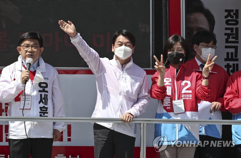 안 대표는 유세차에 올라 "선거를 통해 심판을 해주셔야 이 정부가 정신을 차리고 남은 1년 동안 조금이라도 제대로 일을 하게 만들 수 있다"며 오 후보 지지를 호소했다.