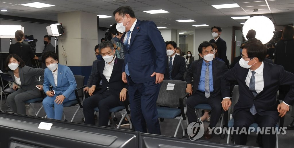 화면을 번갈아 바라보던 김태년 대표 대행은 한숨을 쉬기도 했다.