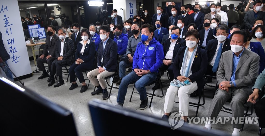 (서울=연합뉴스) 강민경 홍규빈 기자 = 더불어민주당은 7일 서울·부산시장 보궐선거에서 최대 30%포인트 가까이 참패가 예상된다는 지상파 3사의 출구조사 결과가 보도되자 깊은 한숨 속에서 망연자실한 표정을 감추지 못했다.