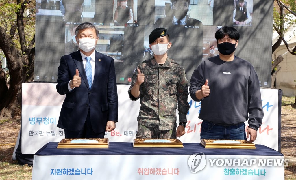 ▲ 병무청은 8일 서울지방병무청에서 온라인 동영상 스트리밍 서비스 왓챠의 박태훈 대표를 초청해 산업기능요원 근무 경험을 바탕으로 한 창업스토리 강연을 듣는 '이야기 공연'(토크 콘서트)을 개최했다. 정석환 병무청장은 박 대표의 강연에 앞서 청년 일자리 창출에 기여한 사람에게 표창장을 수여하고 좋은 일자리 캠페인의 일환으로 '엄지척 핸드 프린팅' 행사를 했다. (서울=연합뉴스)