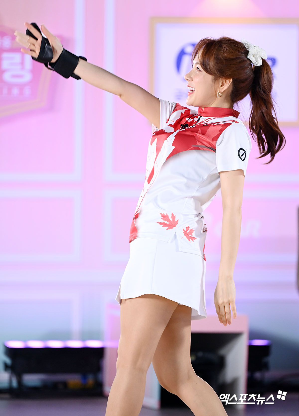 [엑스포츠뉴스 인천, 김한준 기자] 14일 오전 인천 청라동 노블레스볼링센터에서 열린 '인카금융 미스볼링'에 참석한 가수 채연이 투구 후 세리머니를 선보이고 있다.
