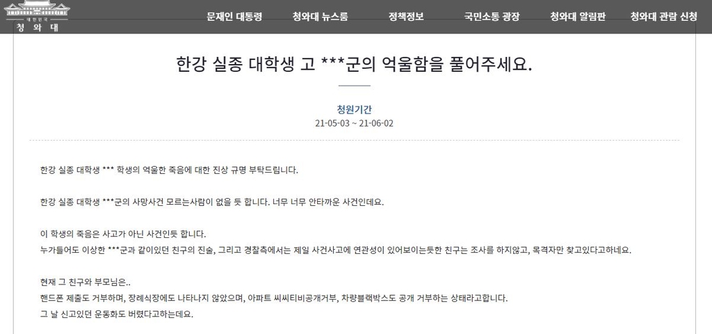 청원인은 "한강 실종 대학생의 억울한 죽음에 대한 진상 규명을 부탁드린다"며 "이 학생의 죽음은 사고가 아닌 사건인 듯하다"고 주장했다.
