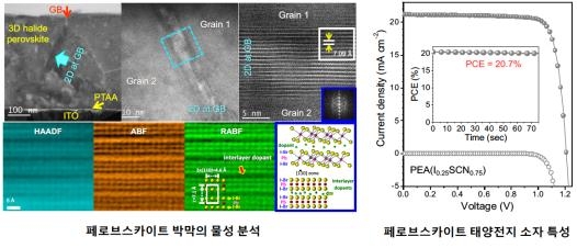 신 교수는 새로운 음이온 첨가제를 도입해 페로브스카이트 박막 내부에 형성되는 2차원 안정화층(passivation layer)의 전기적·구조적 특성을 조절할 수 있음을 이론적으로 규명하고, 고해상도 투과전자현미경 분석으로 확인했다.