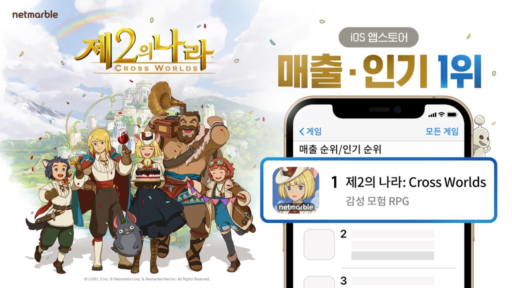 넷마블 '제2의 나라' 국내 출시 첫날 애플 매출 1위…일본은 6위