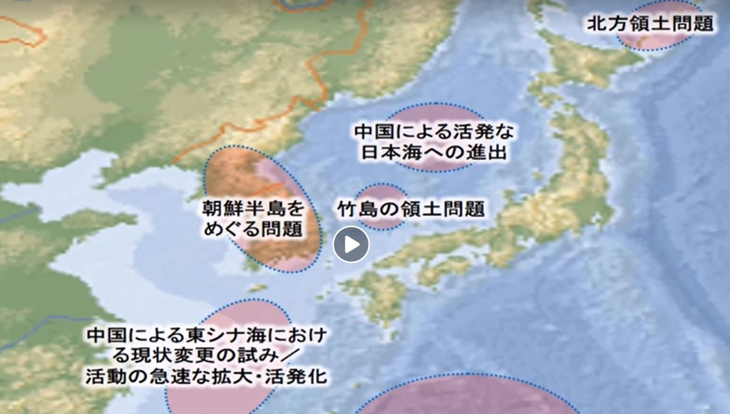 방위성을 비롯한 일본 정부는 독도를 다케시마라고 부르고 있으며 '일본 고유 영토를 한국이 불법 점거하고 있다'는 취지로 주장하고 있는데 이런 인식을 토대로 일본의 안보 정세를 설명하는 장면을 동영상에 반영한 것이다.