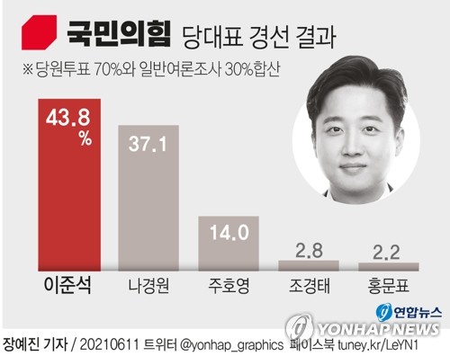 11일 전당대회 당대표 경선에서 이준석 대표는 일반국민 여론조사와 당원투표 결과를 합쳐 9만3천392표(전체 대비 43.8%)를 얻어 1위를 차지했다.