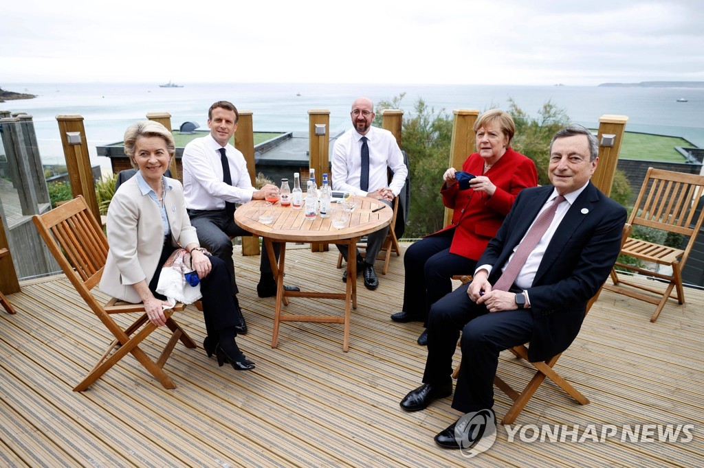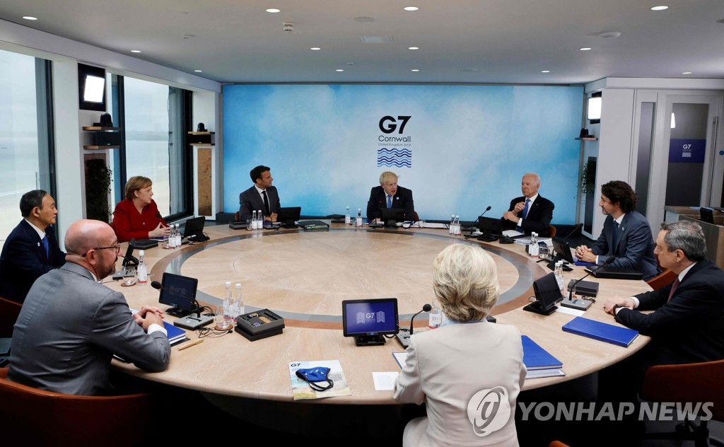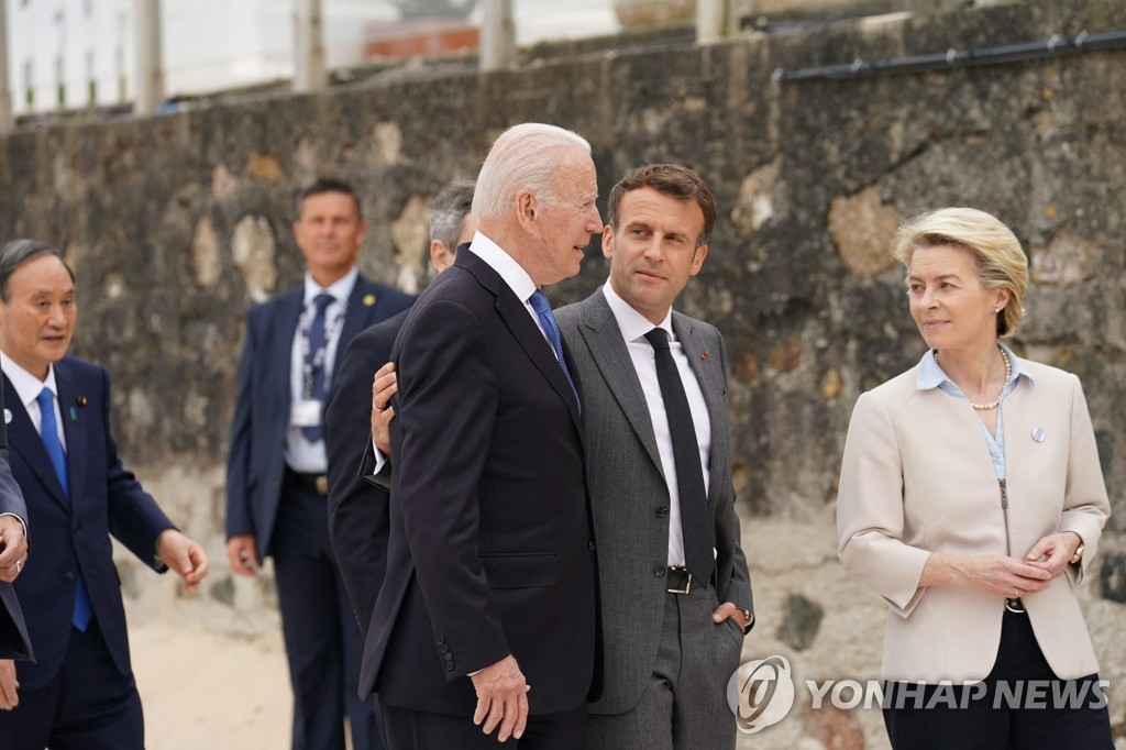 의장국인 영국의 보리스 존슨 총리가 가운데 자리 잡고 옆으로 조 바이든 미국 대통령과 에마뉘엘 마크롱 프랑스 대통령이 양옆에 섰다.