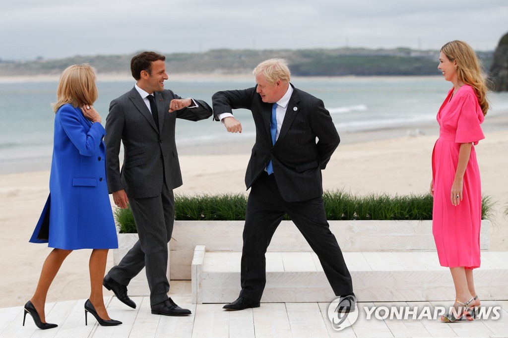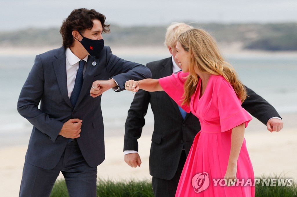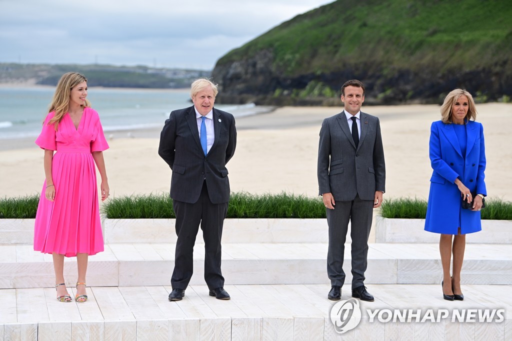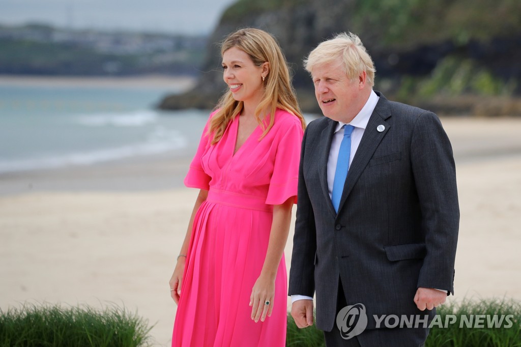존슨 총리와 핫핑크 원피스를 입은 23세 연하의 캐리 존슨 여사가 먼저 도착해 이들을 맞이했다. 이들은 G7 정상회의를 앞두고 지난달 말에 결혼했다. 존슨 총리는 세번째 결혼이다.