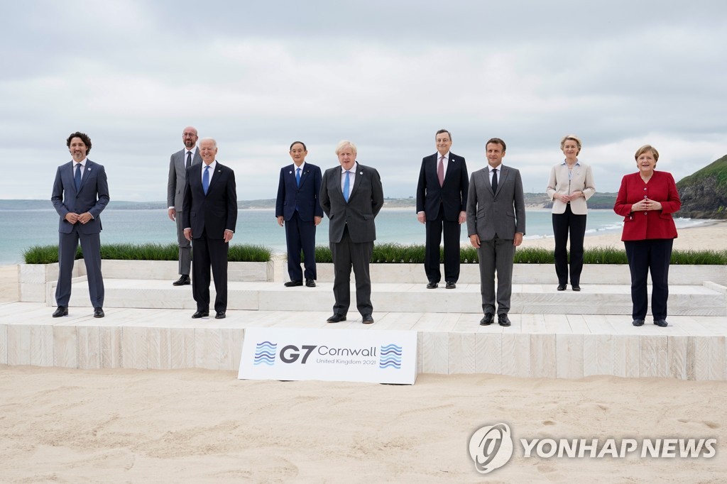 (런던=연합뉴스) 최윤정 특파원 = 주요 7개국(G7) 정상회의가 개막한 11일(현지시간) 오후 회원국 등 정상 부부들은 영국 콘월 바다를 배경으로 기념사진을 찍었다.