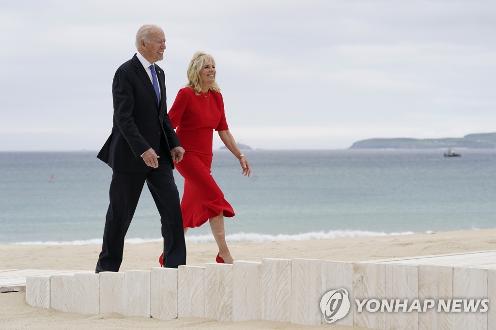 모래사장 위에 깔린 보도를 따라 걸어와 존슨 부부를 만난 질 바이든 여사는 "결혼식에 온 것 같다"고 농담을 했다고 블룸버그 통신이 전했다. 존슨 총리도 "결혼식 행진 같다"고 동조했다.