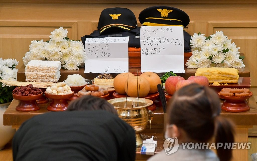 어린 두 딸과 장례식장을 찾은 한 시민은 아이들이 삐뚤빼뚤한 글씨로 김 구조대장을 향해 꾹꾹 눌러쓴 손편지 2장을 제단에 올려둔 뒤 묵념하며 고인을 애도했다.