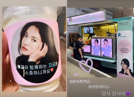 사진 속에는 김은숙 작가가 송혜교를 위해 드라마 '지금, 헤어지는 중입니다'촬영장에 보낸 간식차 풍경이 담겨 있다.