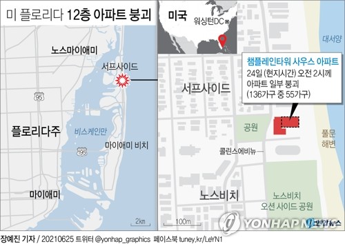(워싱턴·서울=연합뉴스) 이상헌 특파원 홍준석 기자 = 미국 플로리다주에서 24일(현지시간) 새벽에 발생한 아파트 붕괴 현장은 폭격을 맞은 듯 처참했다.