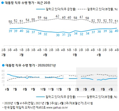 한국갤럽이 지난 22~24일 전국 만 18세 이상 남녀 1천2명을 대상으로 조사한 결과, '문 대통령이 대통령으로서 직무를 잘 수행하고 있다'는 응답은 전주보다 2%포인트 오른 40%로 나타났다.