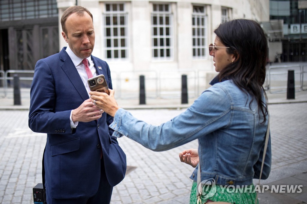 영국 대중지 더 선은 25일(현지시간) 행콕 보건장관이 지난달 6일 오후 런던 보건부 청사에서 측근 지나 콜러댄젤로와 껴안고 키스하는 모습이 담긴 CCTV 화면을 입수해 보도했다.