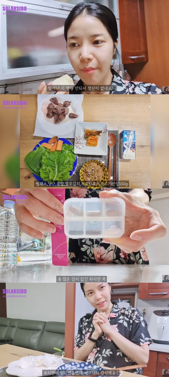 이어 솔라는 소고기 안심 150g, 아몬드 프로틴, 쌈 채소, 당근, 콩밥, 열무김치를 준비해 든든하게 아침을 해결했다. 채소를 싫어해서 이렇게라도 고기를 먹으며 쌈 채소를 함께 섭취한다는 "확실히 채소를 먹는 게 효과가 좋다"며 "제일 든든하게 먹는 아침식사다. 그래선 신이 난다"라며 행복해했다.