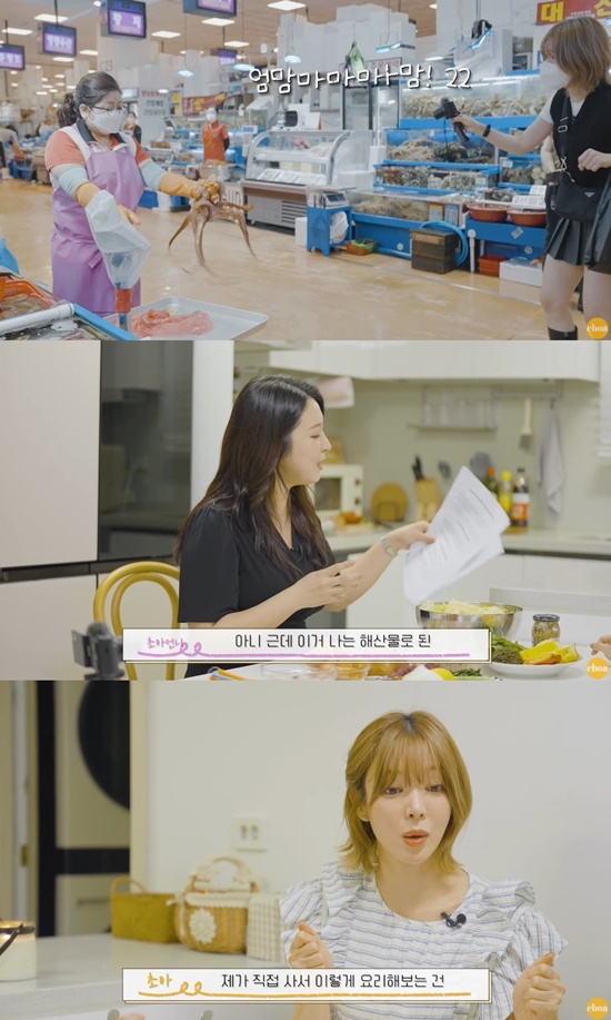 17일 초아의 개인 유튜브 채널 '초아'에는 '수산시장 장보기, 특별게스트와 요리하는 날'이라는 제목의 영상이 게재됐다. 영상 초반 초아는 "지난번 샐러드 품평회에서 레시피를 받았었는데 1,2,3위가 모두 해산물 샐러드였다. 그 해산물 샐러드 재료를 구입하러 직접 노량진 수산시장에 가 보겠다"라는 말과 함께 직접 재료를 사러 떠났다.