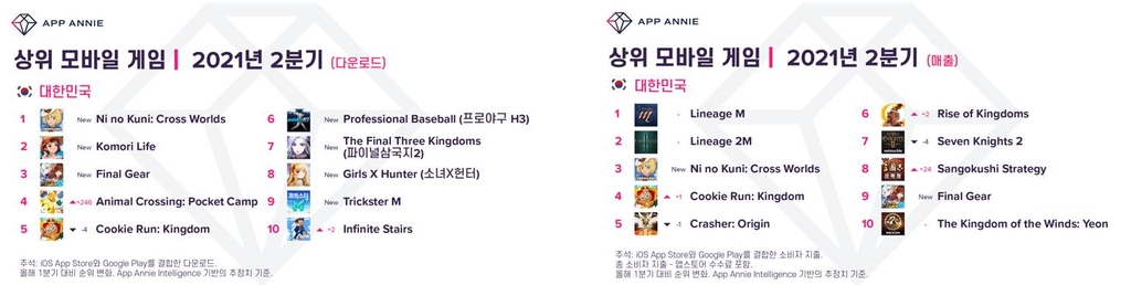 (서울=연합뉴스) 채새롬 기자 = 한국인들이 2분기 가장 많이 다운로드한 게임은 넷마블[251270] '제2의 나라', 가장 많이 지출한 게임은 엔씨소프트[036570] '리니지M'으로 나타났다.