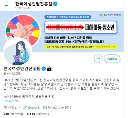여가부 관계자는 "홍보 채널 관리를 어떻게 해왔는지 등 이번 사건과 관련해 여성인권진흥원을 대상으로 19일부터 28일까지 특별감사를 진행 중"이라고 밝혔다.