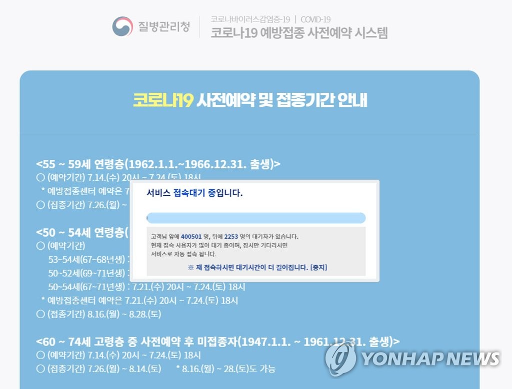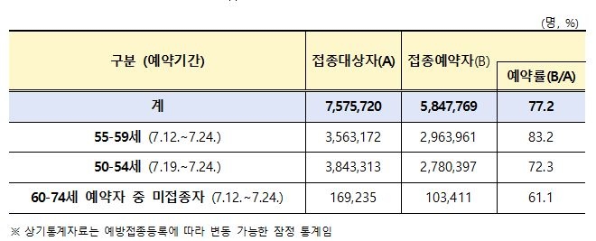 지난 12일부터 사전예약이 진행된 55∼59세 356만3천172명 중 296만3천961명(83.2%), 19일 사전예약이 시작된 50∼54세 384만3천313명 중 278만397명(72.3%)이 예약을 각각 마쳤다.