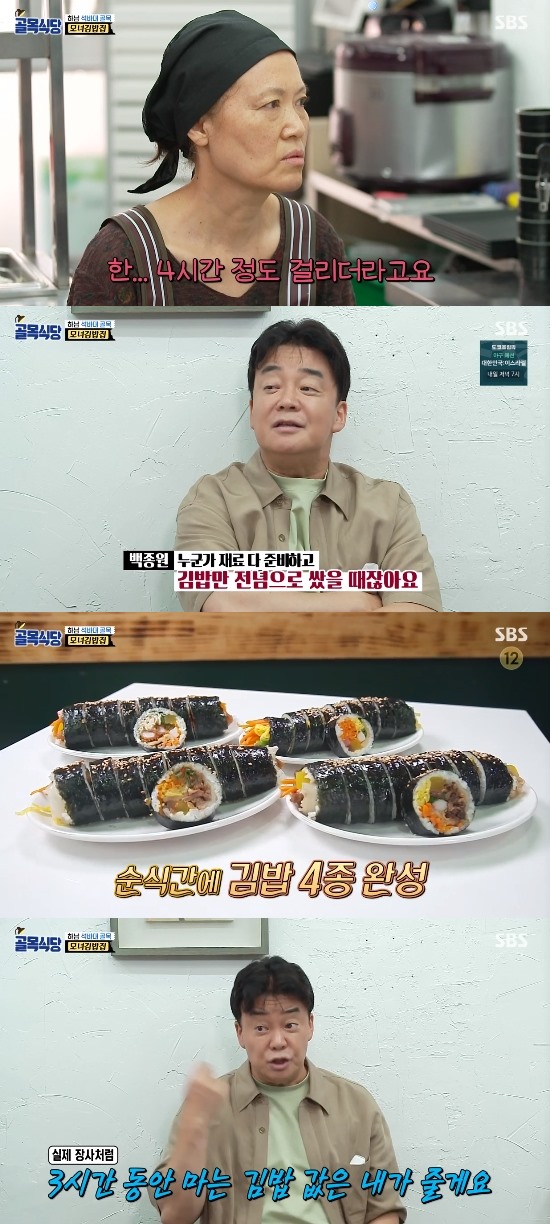 이어 모녀김밥집이 등장했다. 김밥 전문점으로 거듭나기 위해 가게 리모델링도 마친 사장님들. 사장님은 기본 김밥, 돈가스 김밥, 부추 김밥, 묵은지 소고기 김밥, 묵은지 돼지고기 김밥 등을 선보였다. 백종원은 돈가스 김밥에 가장 만족감을 드러냈다. 사장님은 "돈가스와 기본, 묵은지 돼지고기 김밥을 하고싶다"고 했고, 백종원은 "시간당 몇 줄을 말고 파느냐가 중요하다. 3시간 동안 김밥 90줄을 싸봐라. 그 김밥값은 내가 다 주겠다"고 미션을 내렸다.