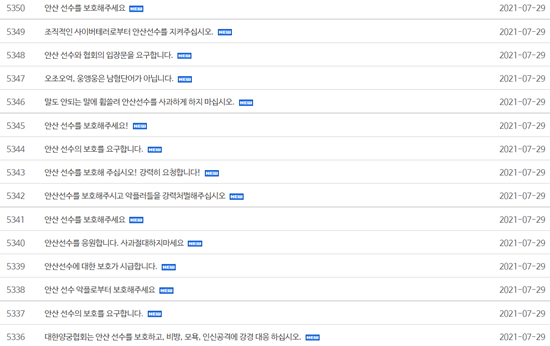 29일 대한양궁협회 홈페이지 자유게시판과 응원메세지에는 안산을 응원하는 게시물이 쏟아지고 있다. 특히 안산을 보호해달라는 글들이 게시판을 장악했다. 한 네티즌은 "머리가 짧다는 이유로 남자들에게서 외모 품평을 넘어 온갖 도를 넘은 비난의 말들이 쏟아지고 있습니다"라고 목소리를 내며 선수 보호를 요청했다.