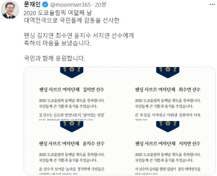 문 대통령은 1일 개인 트위터에 "2020 도쿄올림픽 여덟째 날 대역전극으로 국민들께 감동을 선사한 펜싱 김지연, 최수연, 윤지수, 서지연 선수에게 축하의 마음을 보냈다. 국민과 함께 응원한다"라며 격려와 축하 인사를 전했다.