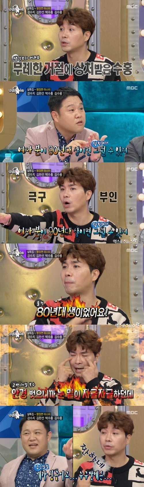 그는 "와인 코너에서 연예인 모자를 쓰고 남자 야상을 입었는데 하의실종이었다. 안경을 귀엽게 쓴 여자분이 계속 날 쳐다봤다. 눈을 마주치면 피하면 되는데 웃는 거다. 나도 모르게 '실례가 안 된다면 인상이 너무 마음에 드는데 커피 한잔 할까요' 했다. 조심스럽게 예의를 갖춰서 말했다. 날 보면서 웃더라. 모자와 안경을 벗더니 '저 보기보다 어려요'라고 했다. 앞에 계산하는 분이 못 들은 척하고 갑자기 손이 빨라지더라. 솔직히 '죄송해요' 이렇게 얘기해도 될 건데"라며 상처 받은 마음을 하소연했다.