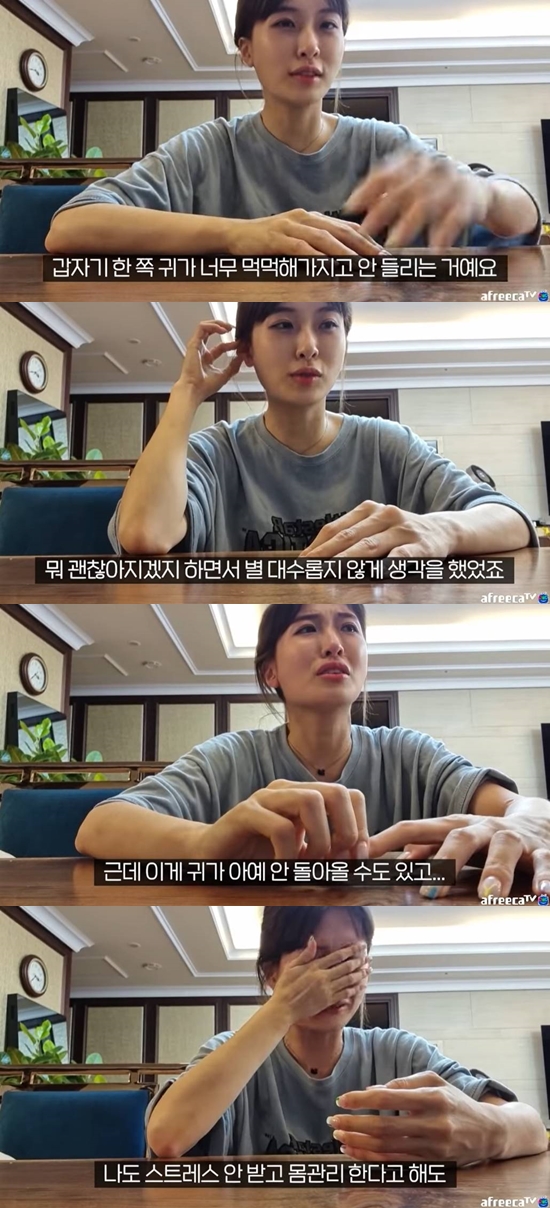 이어 "너무 답답해 죽겠는 거다. 귀가 아예 안 돌아올 수도 있고 치료한다고 해도 반만 돌아올 수 도 있다고 하는데 스트레스 안 받고 몸 관리한다고 해도 계속 나도 모르게 쌓인다. 계속 경과를 지켜봐야 한다"라며 "약만 먹어서 낫는다는 건 아니다. 생활패턴도 안 좋고 밥 먹는 것도 불규칙적이고 내 욕심으로 망친 것도 맞다. 자궁에는 혹이 계속 생겨나고 구토하고 쓰러지고 이제 귀까지 안 들린다고 하니까 너무 무서웠다"라며 눈물을 쏟아냈다.