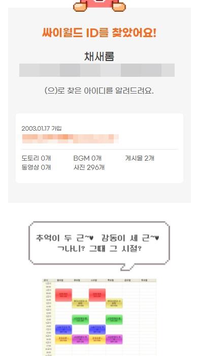 시간에 맞춰 싸이월드 홈페이지를 찾아 실명 인증을 하니 지금은 존재하지 않는 포털 주소가 붙은 가입 이메일 아이디가 나왔다.