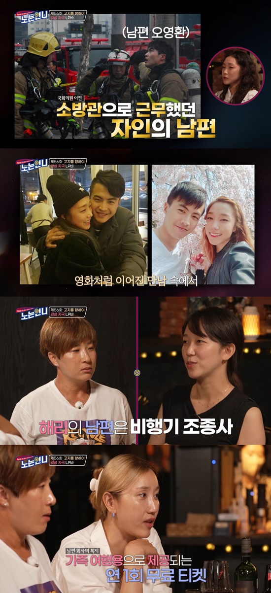 또, 3년간 연애를 했다는 김자인은 '소방관 아저씨'라고 부르는 것에서 '아저씨'라는 애칭으로 부른다고 해 부러움을 유발했다. 이어 조해리는 남편의 직업이 비행기 조종사라고 밝히며 "해외 비행 동안은 혼자 지낸다"라고 했다. 코로나19로 함께 가지 못한다는 조해리는 "1년에 한 번은 가족여행용으로 제공되는 무료 티켓이 있는데, 어느 나라를 가든 상관없다"며 "그걸로 제주도를 갔다"라며 아쉬운 마음을 드러냈다.