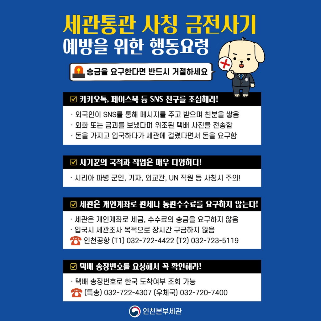 인천세관은 "SNS를 통해 알게 된 누군가가 외국에서 국내로 보낸 물품의 통관과 관련해 금품을 요구한다면 사기일 가능성이 높으니 반드시 세관에 먼저 문의해 사실 여부를 확인해 달라"고 당부했다.