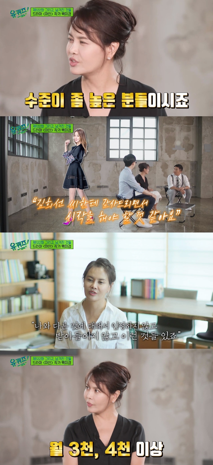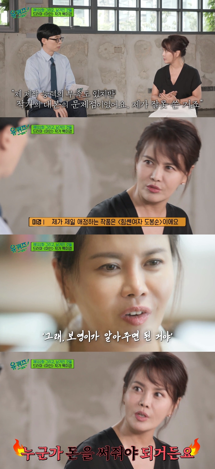 (엑스포츠뉴스 박예진 인턴기자) '유 퀴즈 온 더 블럭' 백미경이 드라마 작가에 대해 많은 이야기를 털어놓았다.