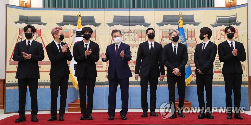 문 대통령은 BTS의 히트곡 '버터'가 빌보드 1위를 재탈환하고, BTS가 미국 음악 시상식 'MTV 비디오 뮤직 어워즈'에서 3관왕에 오른 점을 축하한 뒤 "뮤직 어워즈 '올해의 그룹' 분야에서 블랙핑크와 경합했다는 보도가 나오는데, 한국 팝의 유력을 보여줬다고 생각한다"고 말했다.