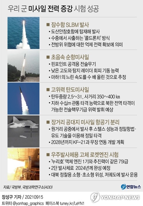 (서울=연합뉴스) 정빛나 기자 = 정부와 군 당국이 북한의 신형 장거리 순항미사일 시험발사 공개 이틀 만인 15일 속도가 압도적으로 빠른 초음속 순항미사일 개발에 성공한 사실을 발표했다.