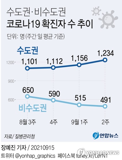 이 중 수도권의 일평균 지역발생 확진자는 1천326.4명으로 직전 주(1천180.7명) 대비 145.7명 증가했지만, 비수도권은 437.0명으로 직전 주(500.0명)보다 63.0명 감소했다. 수도권의 증가세가 비수도권의 감소세를 상쇄하고도 남을 정도다.