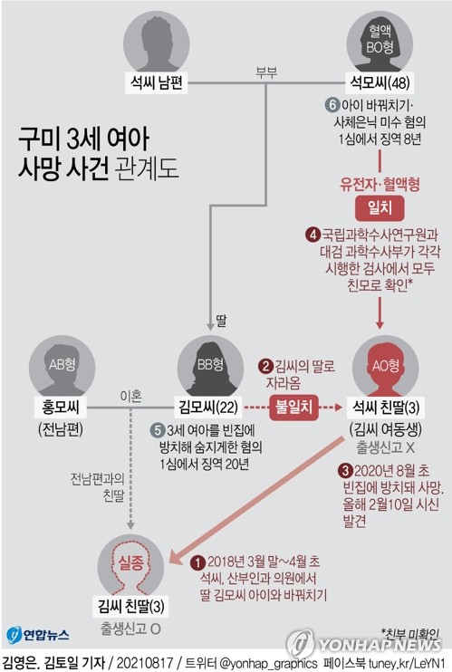 이와 별도로 김씨와 숨진 3살 여아의 친어머니인 석모(48)씨는 2018년 3∼4월께 자신이 출산한 딸을 김씨가 낳은 딸과 바꿔치기한 혐의(미성년자 약취 등)로 구속기소돼 1심에서 징역 8년을 선고받고 항소했다.
