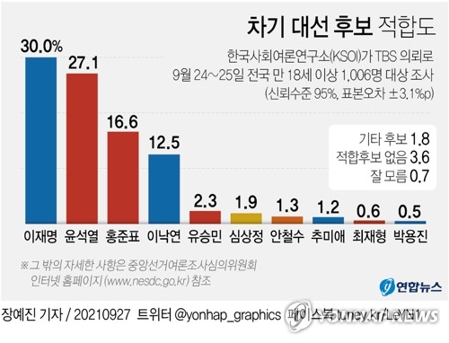 한국사회여론연구소(KSOI)가 TBS 의뢰로 지난 24∼25일 전국 만 18세 이상 1천6명을 대상으로 차기 대선후보 적합도를 물은 결과, 이 지사가 30.0%, 윤 전 총장이 27.1%를 각각 기록하면서 이 지사가 오차범위 내에서 앞섰다.
