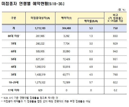 고등학교 3학년 접종 등에 포함된 17세 이하 연령층을 제외하면 80세 이상의 예약률이 1.3%(26만1천965명 중 3천292명)로 가장 낮았다.
