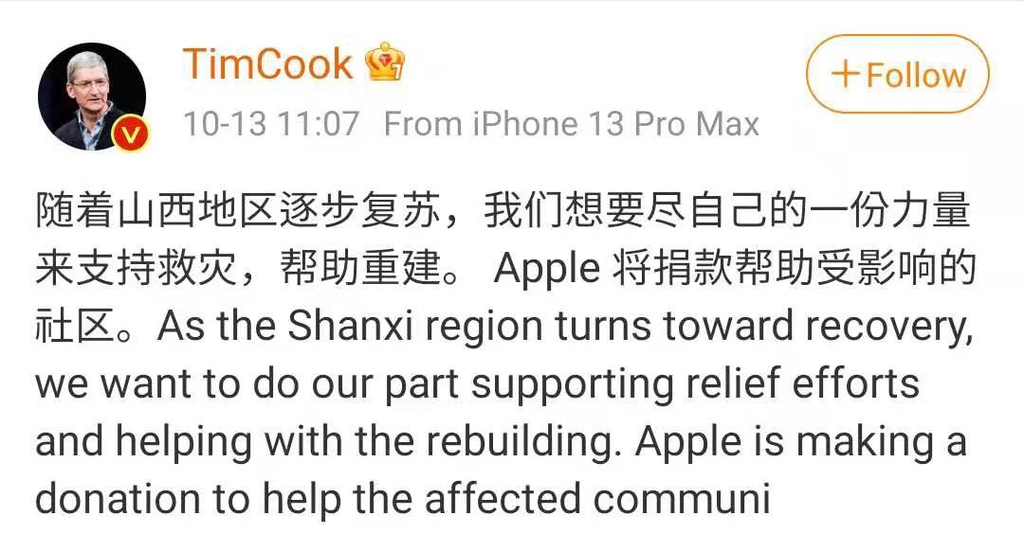 14일 관영 글로벌타임스에 따르면 팀 쿡 애플 최고 경영자(CEO)는 전날 중국판 트위터인 웨이보(微博)에 영어와 중국어로 "산시성 홍수피해 복구 활동을 지원하고 싶다"고 밝혔다.