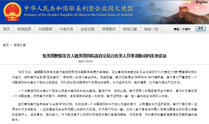 중국대사관은 "미국은 대만을 이용해 중국을 제압하겠다는 생각을 버려야 한다"며 "하나의 중국 원칙과 중국의 핵심 이익에 도전하는 어떠한 언행도 단호한 반격을 받을 것"이라고 경고했다.