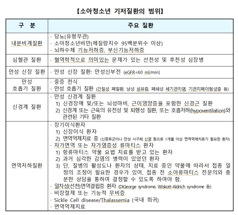 정부는 "소아·청소년의 경우 본인과 부모가 자발적으로 접종 여부를 선택할 수 있다"면서도 "기저질환이 있는 소아·청소년은 건강한 청소년보다 코로나19 감염 시 위중증으로 진행될 위험이 약 2배 높다"며 접종을 권고했다.