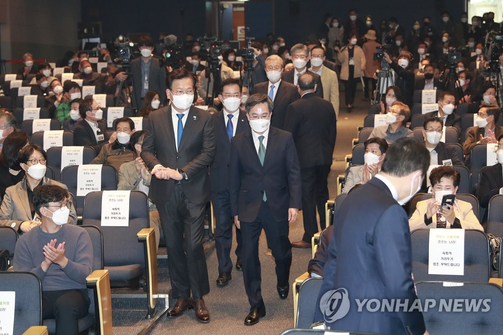 김 전 부총리는 이날 취재진과 만나 거대 양당 대표들이 행사에 참석해 '러브콜'을 보낸 데 대해서는 "저희는 저희 길을 간다"며 "20년 동안 해결하지 못한 대한민국의 묵은 문제는 기존의 강고한 양당 구조로는 해결할 수 없다"라고 강조했다.